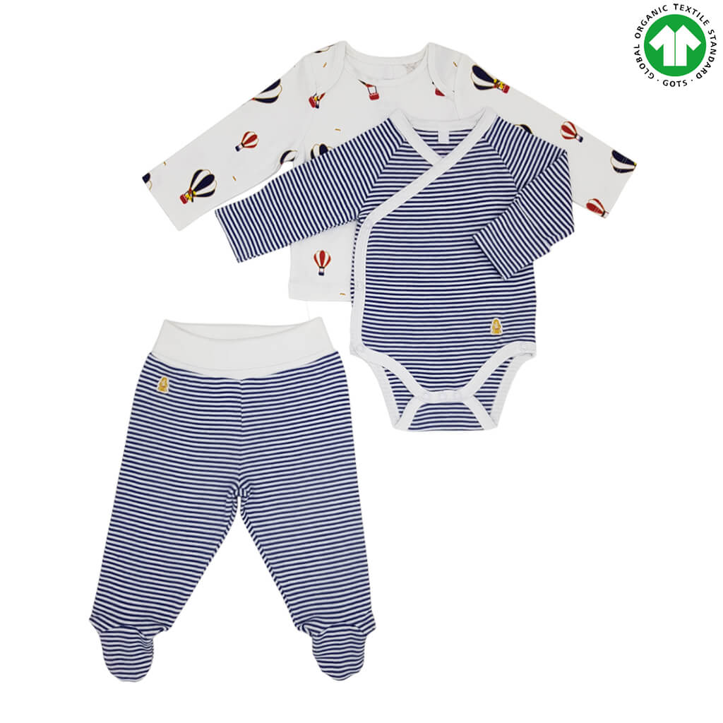 This set includes: 1x Kimono bodysuit, 1x Footed trousers, 1x T-Shirt from our sky balloons collection